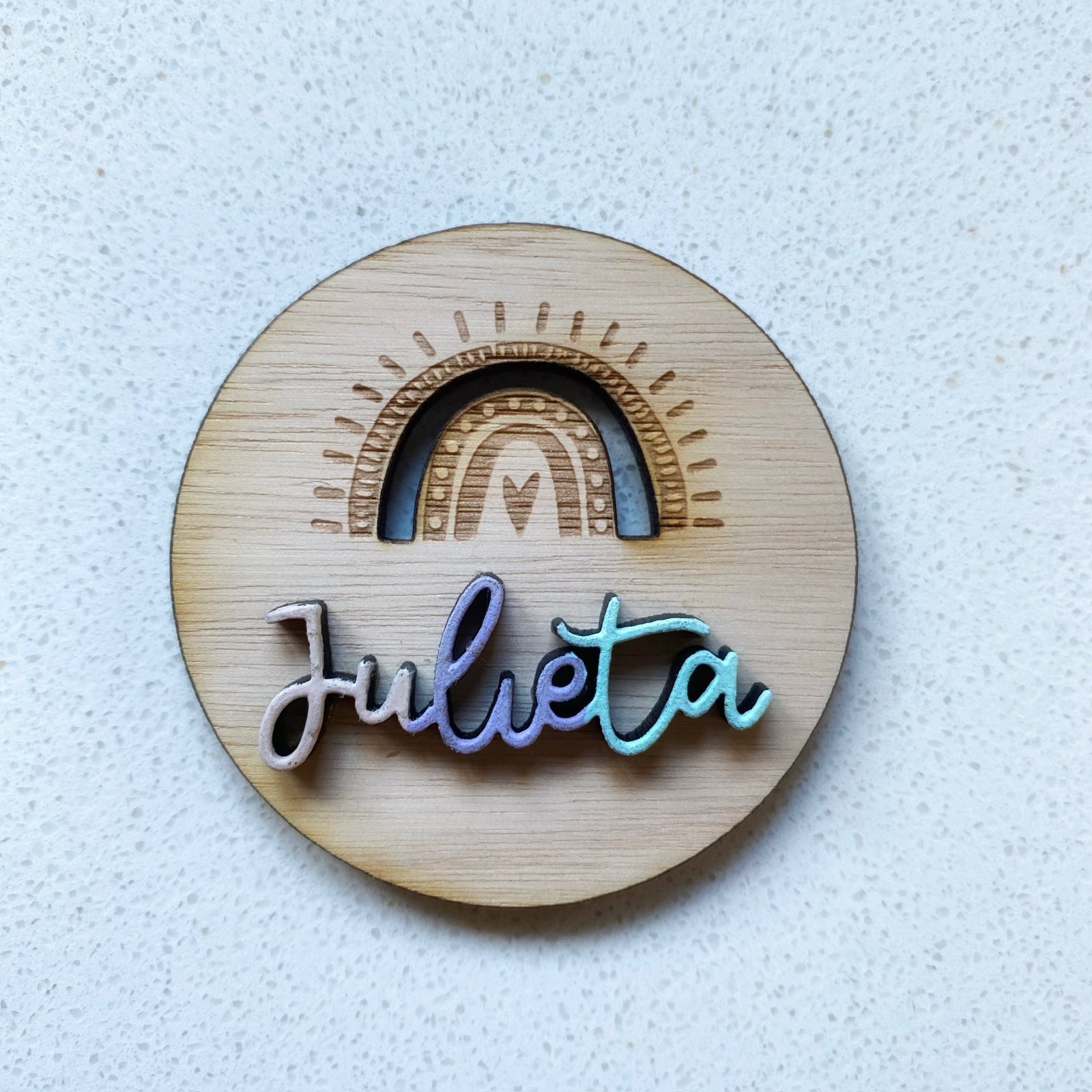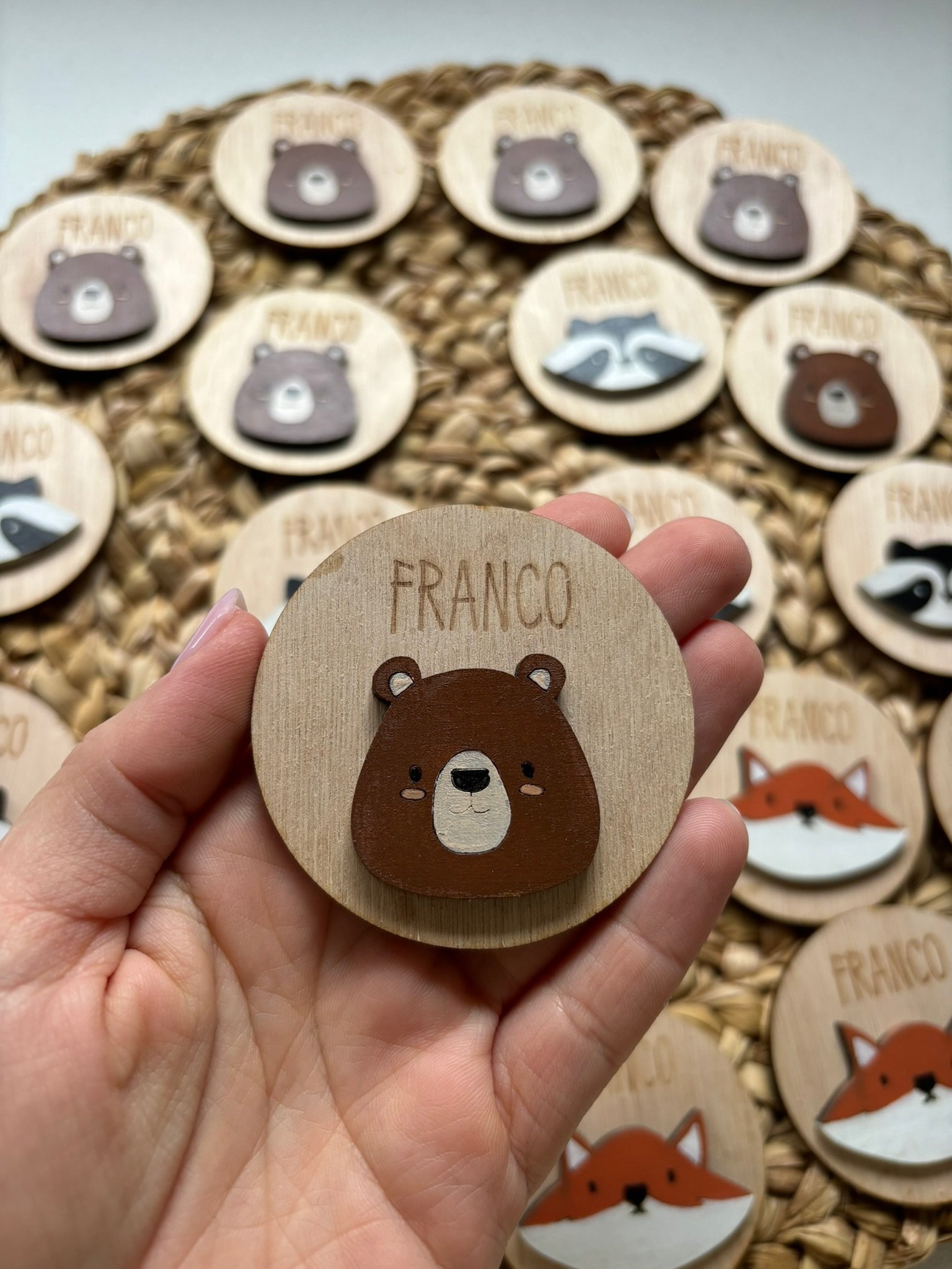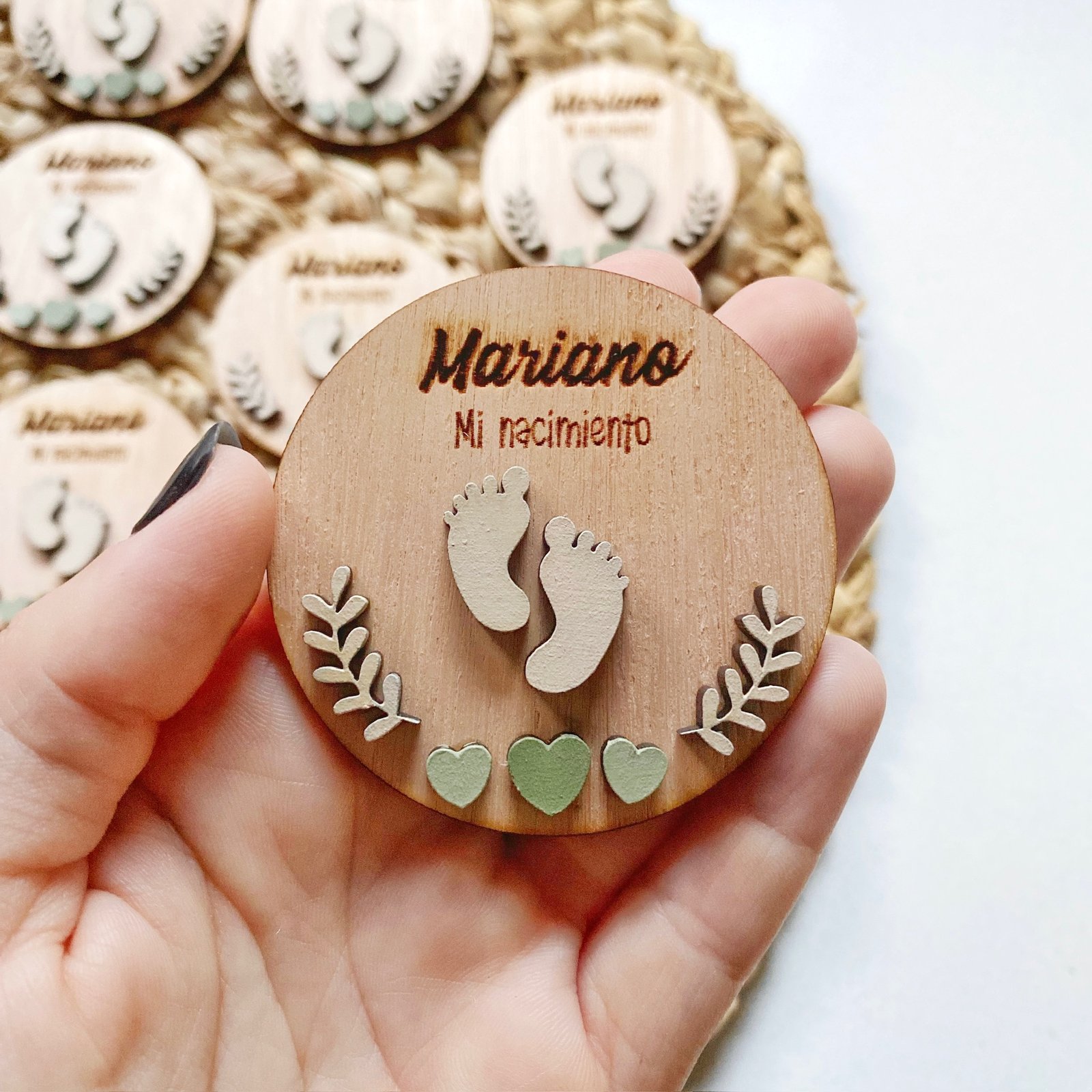 🤎 Imanes con diseño en relieve pintado, con nombre grabado adelante y frase atrás